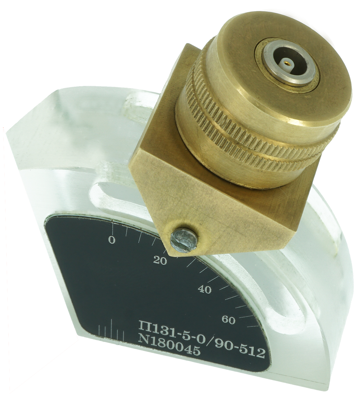 Простая, надежная конструкция с минимальным количеством деталей. На призму нанесена шкала для отсчета текущего угла падения луча. Обозначение преобразователя – П131-ХХ-0-90 (где ХХ – требуемая частота).